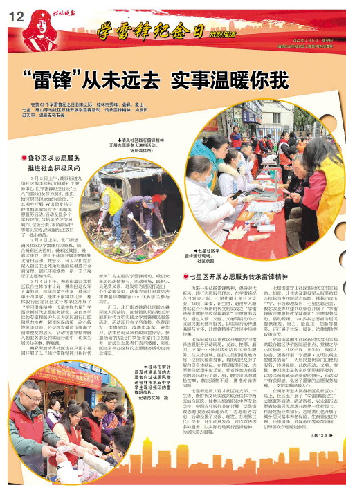 同时,各社区共建单位也来到社区,发挥党员先锋力量,为居民送服务。3月5日,叠彩区北门街道水塔社区新时代文明实践站联合“双报到”单位桂林市二附实验学校共同开展了“学习雷锋精神共筑清洁家园”志愿服务活动,对辖区内鸭湖公园进行了集中清扫,美化社区环境。3月5日上午,叠彩街道宝积社区联合辖区共建单位共同开展“传承雷锋精神关爱社区健康”志愿服务活动,社区志愿服务团队为居民们提供了口腔检查、视力检测、中医把脉、健康义诊等服务。
