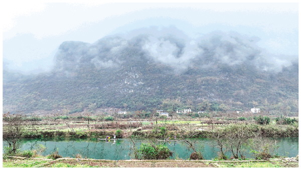 近日,春雨绵绵,阳朔县遇龙河周边的山峰在烟雨中若隐若现,游人乘竹筏泛舟,赏水墨丹青画卷。 记者滕嘉 摄