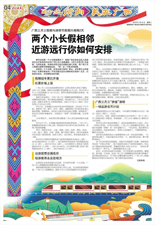那么,市民利用4天假期可以去哪里玩?桂林和顺国旅工作人员陈女士进行了推荐。她表示,与往年相比,今年广西三月三假期比较早,还没有进入旅游旺季,所以4天动车出游的价格基本在1500元左右。