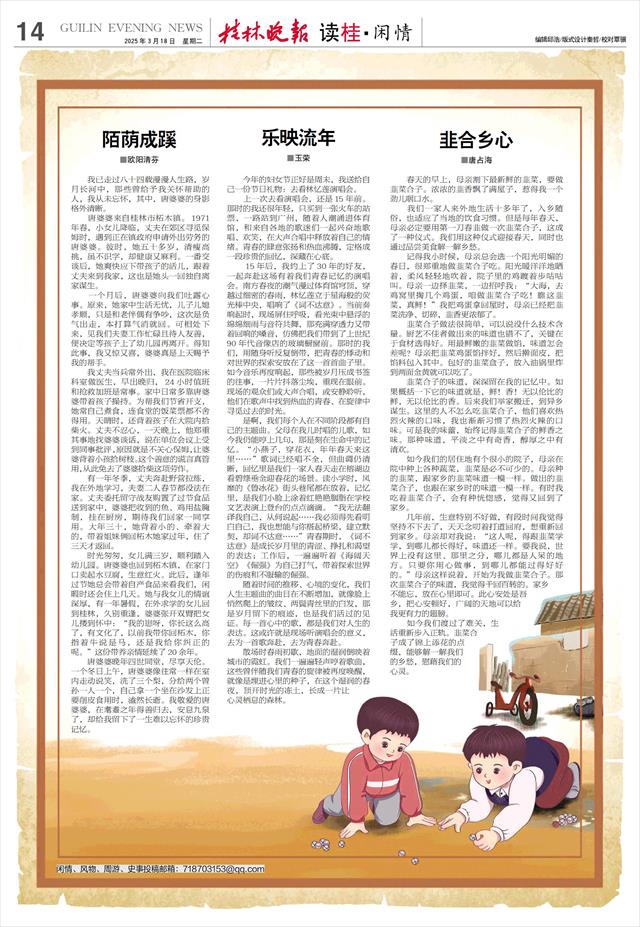 时光匆匆,女儿满三岁,顺利踏入幼儿园。唐婆婆也回到柘木镇,在家门口卖起水豆腐,生意红火。此后,逢年过节她总会带着自产食品来看我们,闲暇时还会住上几天。她与我女儿的情谊深厚,有一年暑假,在外求学的女儿回到桂林,久别重逢,婆婆张开双臂把女儿搂到怀中:“我的崽呀,你长这么高了,有文化了,以前我带你回柘木,你指着牛说是马,还是我给你纠正的呢。”这份带养亲情延续了20余年。