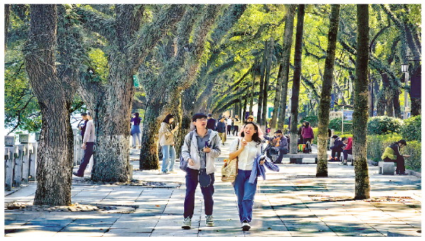 19日下午,春日温暖的阳光透过嫩绿的香樟树叶洒在滨江路上,游人在树荫下悠闲散步。