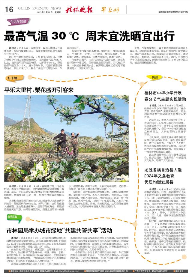 今天,桂林晚报推出特别报道《AI勾勒春花韵 看我桂林展芳华》,记者结合AI推荐和实地采访,为市民筛选了桂林市区及周边欣赏油菜花、樱花、梨花、山苍子花的好去处,并结合花期、出行方式等信息制作了示意图和攻略。眼下正是外出踏青赏花的最佳时期,你不妨带着今天的晚报走出去,感受春天的美好和大自然的活力。