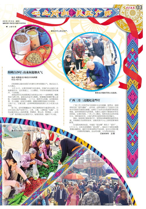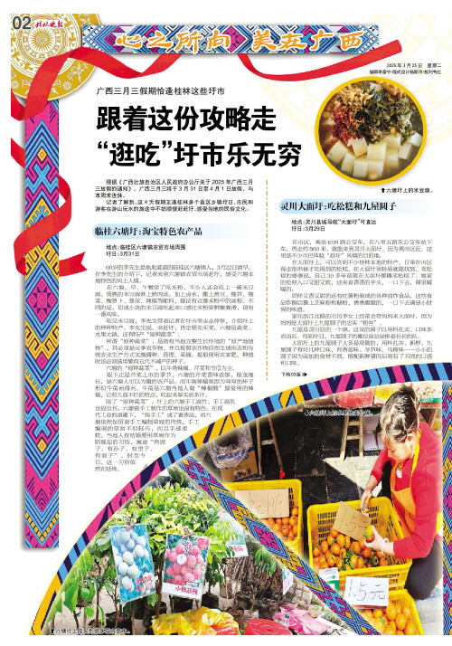 “逛吃”圩市乐无穷   根据《广西壮族自治区人民政府办公厅关于2025年广西三月三放假的通知》,广西三月三将于3月31日至4月1日放假,与本周末连休。