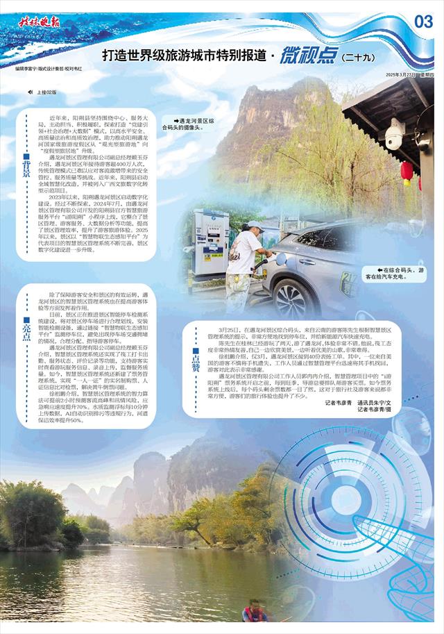 数字化建设进一步升级   阳春三月,阳朔遇龙河景区的游客络绎不绝。遇龙河指挥中心主任徐祖鹏告诉记者,景区自2023年启动数字化建设以来,逐步完善软硬件建设,以“智慧物联生态感知平台”为代表项目的智慧景区管理系统不断完善,景区数字化建设进一步升级。