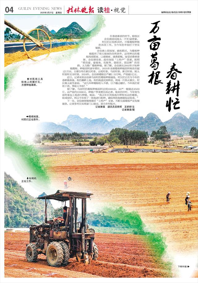 万亩葛根春耕忙   在春意渐浓的时节,临桂区会仙镇田间地头一片忙碌景象,村民们正抢抓农时,开展葛根种植的各项工作,为今年的丰收打下坚实基础。