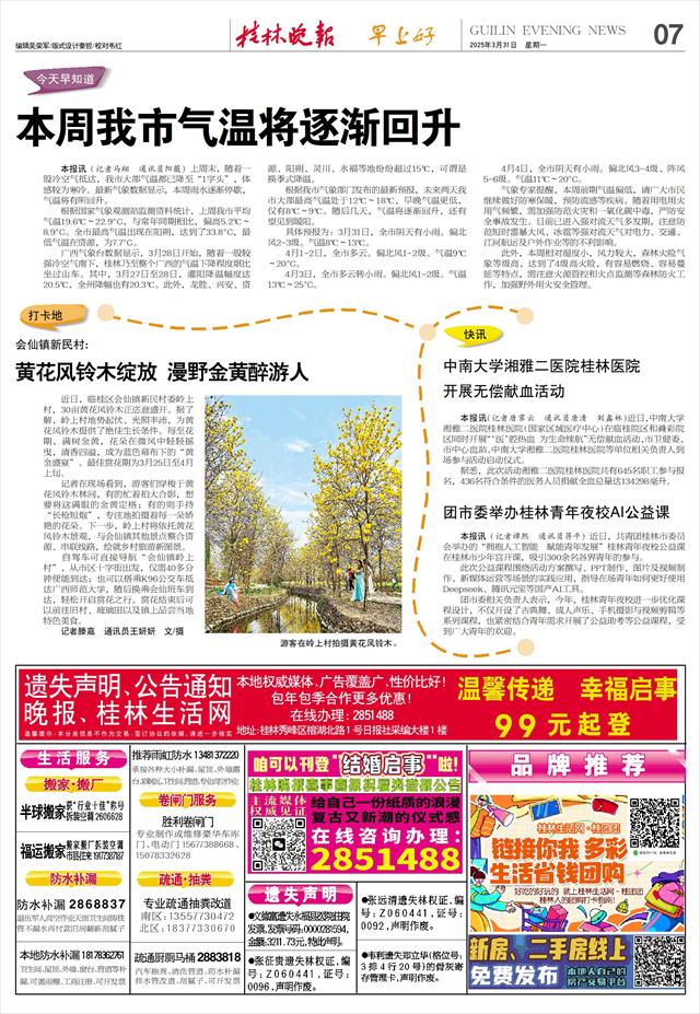 会仙镇新民村: 黄花风铃木绽放 漫野金黄醉游人   近日,临桂区会仙镇新民村委岭上村,30亩黄花风铃木正恣意盛开。据了解,岭上村地势起伏、光照丰沛,为黄花风铃木提供了绝佳生长条件。每至花期,满树金黄,花朵在微风中轻轻摇曳,清香四溢,成为蓝色幕布下的“黄金盛宴”。最佳赏花期为3月25日至4月上旬。
