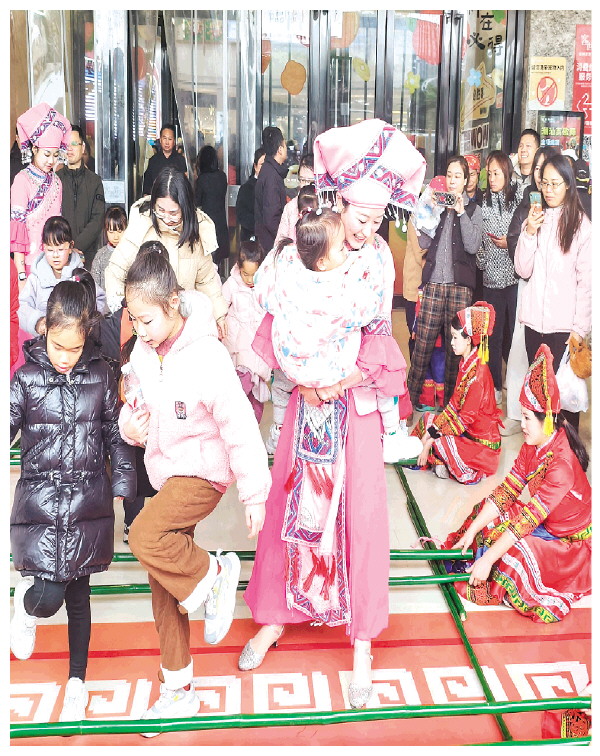 3月30日,在客世界广场上,身着少数民族服装的工作人员抱着不敢参与竹竿舞的小朋友跳舞,一起体验广西特色少数民族传统文化。 记者滕嘉 摄