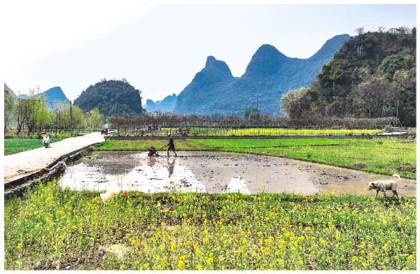 春日渐暖,近日,临桂区会仙镇的田野上机声隆隆。一名村民正驾驶农机翻整土地,犁铧过处泥土翻涌,为将来的丰收播撒希望。 记者滕嘉 摄
