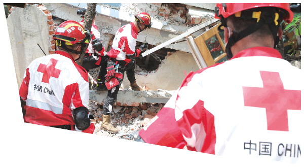 ↑3月31日,中国红十字国际救援队队员在缅甸曼德勒开展救援。 新华社发