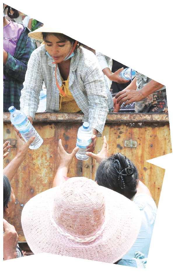 ↑4月1日,在缅甸实皆市,志愿者向受灾民众发放生活物资。 新华社发