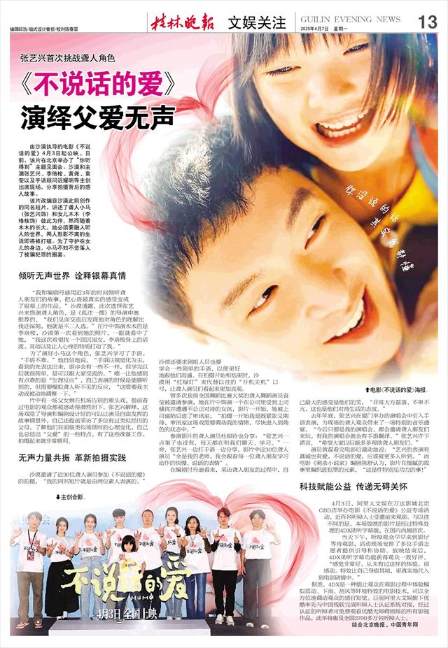 由沙漠执导的电影《不说话的爱》4月3日起公映。日前,该片在北京举办了“你听得到”主题见面会。沙漠和主演张艺兴、李珞桉、黄尧、袁莹以及手语顾问迟耀明等主创出席现场,分享拍摄背后的感人故事。