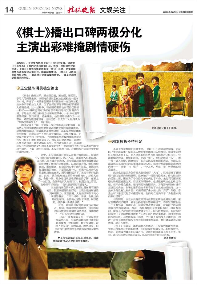 3月25日,王宝强携新剧《棋士》回归小荧幕,这是继《士兵突击》《我的兄弟叫顺溜》后,他再一次担纲电视剧主演。《棋士》聚焦围棋老师崔业“黑化”之路,凭借高能剧情与演员阵容未播先火。随着剧集播出,《棋士》口碑却呈现两极分化:一面是对王宝强演技的盛赞,一面是对剧情逻辑漏洞的争议。
