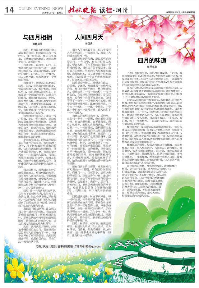 此刻,我再次张开双臂,深深地呼吸着四月的空气。我感觉到自己仿佛与大自然融为了一体,与这个世界有了更深的联系。我把四月揽进怀里,也把自己的心,留在了这个美好的季节里。