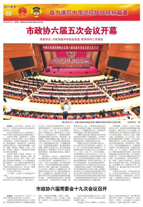 李楚强调,今年是“十四五”规划的收官之年,是桂林世界级旅游城市建设奋进年,做好各项工作至关重要。我们要坚持以习近平新时代中国特色社会主义思想为指导,坚持实干为要、创新为魂,用业绩说话、让人民评价,以打造世界级旅游城市为统揽,守好山清水秀的自然生态、风清气正的政治生态,充分发挥比较优势,坚持有所为、有所不为,突出科创赋能强产业、文旅焕新促转型、项目建设扩投资、县域经济强支撑,以“人工智能+”赋能千行百业,唱响高质量发展主旋律,推动世界级旅游城市建设奋进突破。全市各级政协组织和广大政协委员要继续发扬优良传统,牢记职责使命,坚持党的领导、统一战线、协商民主有机结合,充分发挥专门协商机构的作用,积极参政议政,多建睿智之言、多献务实之策、多聚团结之力,凝心聚力谱写中国式现代化桂林篇章。
