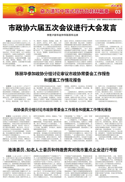 市政协六届五次会议进行大会发言 李楚卢新华赵仲华陈丽华出席   本报讯(记者张婷婷)4月9日,市政协六届五次会议在桂林市会议中心大礼堂进行大会发言。8位市政协委员围绕桂林经济社会高质量发展和人民群众关心关注的热点问题作大会发言。