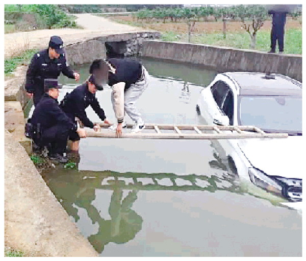 4月7日11时许,永岁派出所接到110转来的交通事故派遣警情:一男子驾驶车辆经过永岁村委三桂村时,因不熟路况、车速过快刹车不及,冲入了村外的水塘。报警人林先生表示,自己不会游泳,且不清楚水塘深浅,被困在池塘中,情况危急,请求民警支援。