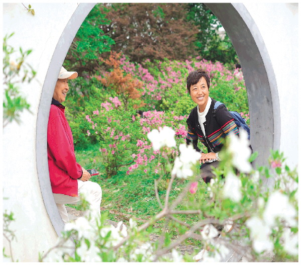 眼下,桂林春意盎然。4月12日下午,两名游人在七星公园杜鹃景苑赏花游玩,盛开的杜鹃花给人们增添了不少快乐。 记者邢刚 摄