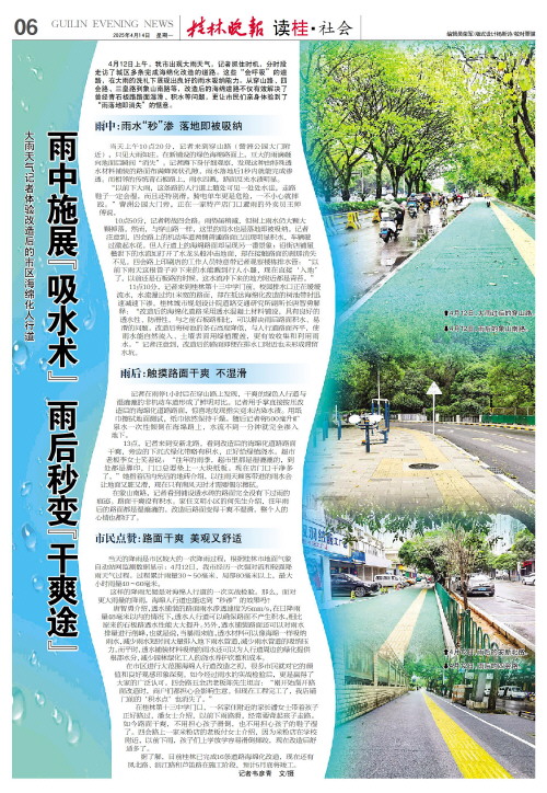 11点10分,记者来到桂林第十三中学门前。校园排水口正在缓缓流水,水流漫过约1米宽的路面,却在抵达海绵化改造的树池带时迅速减速下渗。桂林城市规划设计院道路交通研究所副所长唐智勇解释:“改造后的海绵化道路采用透水混凝土材料铺设,具有良好的透水性、防滑性。与之前石板路相比,可以解决雨后路面积水、易滑的问题。改造后将树池的条石高度降低,与人行道路面齐平,使雨水能自然流入、土壤表面用绿植覆盖,更有效收集和利用雨水。”记者注意到,改造后的路面即便在排水口附近也未形成滞留水坑。