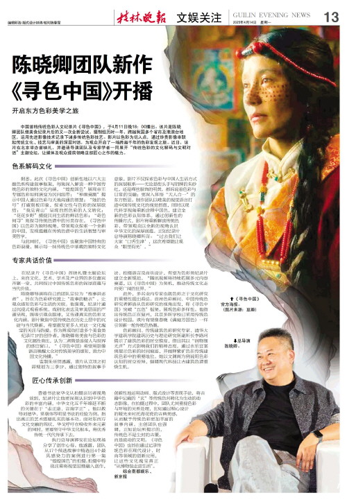 《寻色中国》开播 开启东方色彩美学之旅   中国首档传统色彩人文纪录片《寻色中国》,于4月11日晚18:00播出。该片是陈晓卿团队继美食纪录片后的又一次全新尝试,摄制组历时一年,跨越我国多个省市及港澳台地区,运用先进影像技术记录下诸多传统色彩技艺。影片以色彩为切入点,通过珍贵影像串联起传统文化、技艺与审美的深层对话,为观众开启了一场跨越千年的色彩发现之旅。近日,该片在北京举办首映礼,并邀请导演团队及专家学者一同展开“传统色彩的文化解码与文明对话”主题论坛,让媒体及观众提前领略这部匠心之作的魅力。