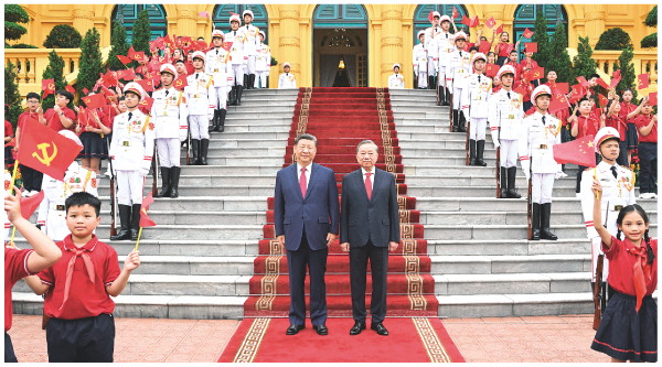 习近平指出,构建中越命运共同体具有重要世界意义。两国携手走和平发展道路,15亿多人口共同迈向现代化,将有力维护地区乃至世界和平稳定,促进共同发展。两国都坚持对外开放,为维护地区产业链供应链稳定畅通、促进经济全球化发挥了积极作用。小船孤篷经不起惊涛骇浪,同舟共济方能行稳致远。中国和越南都是经济全球化的受益者,要增强战略定力,共同反对单边霸凌行径,维护全球自由贸易体制和产业链供应链稳定。