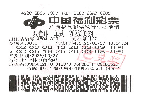 桂林福彩又迎喜事。3月27日晚,中国福利彩票双色球游戏第2025033期开奖,红球号码为03、05、18、25、26、33,蓝球号码为08。该期双色球全国共开出11注一等奖,江苏3注、湖南2注、广东2注,北京、黑龙江、广西、陕西各1注,单注奖金621.4385万元。该期销量3.79亿元,筹集公益金1.36亿元。