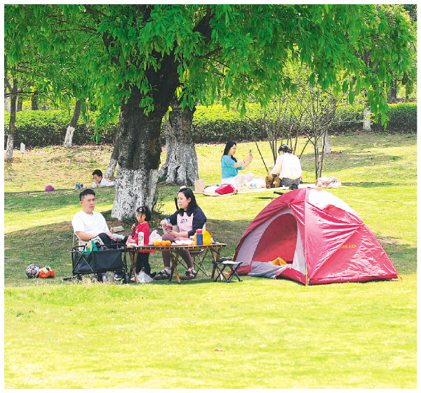 4月14日,天气晴好,市民在山水公园的草坪上搭起帐篷、铺好野餐垫,在郁郁葱葱的树荫下尽享悠闲时光。 记者邢刚 摄
