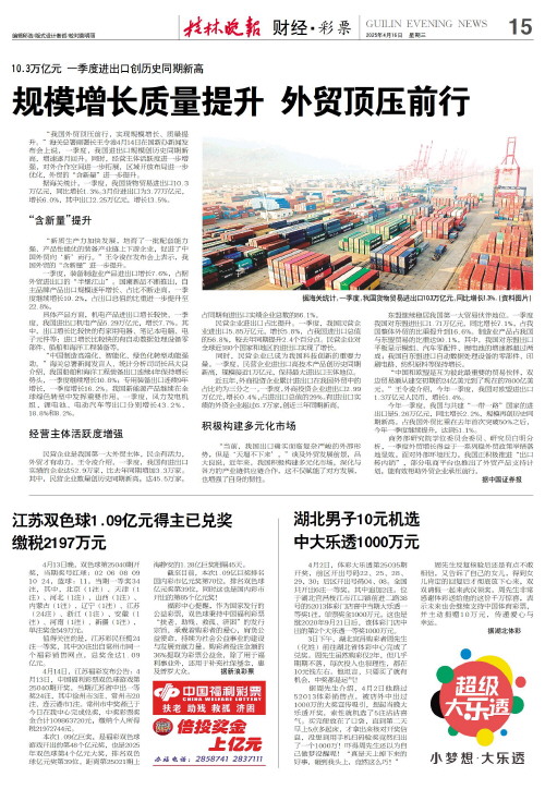 “我国外贸顶压前行,实现规模增长、质量提升。”海关总署副署长王令浚4月14日在国新办新闻发布会上说,一季度,我国进出口规模创历史同期新高,增速逐月回升。同时,经营主体活跃度进一步增强,对外合作空间进一步拓展,区域开放布局进一步优化,外贸的“含新量”进一步提升。