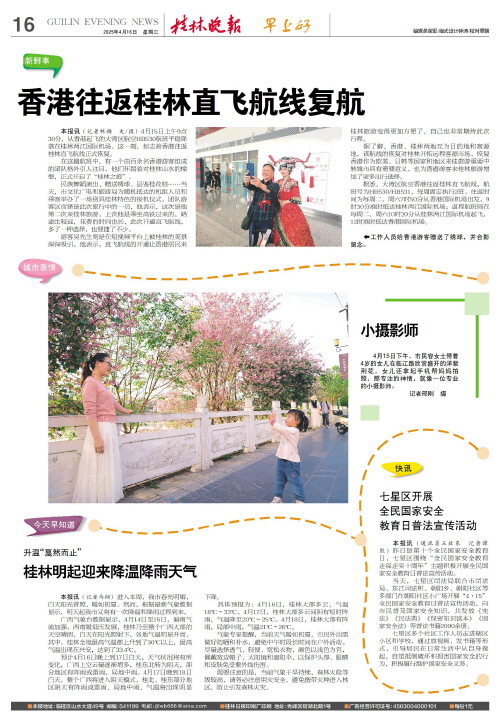 香港往返桂林直飞航线复航   本报讯(记者林扬 文/摄)4月15日上午9点30分,从香港起飞的大湾区航空HB530航班平稳降落在桂林两江国际机场。这一刻,标志着香港往返桂林直飞航线正式恢复。
