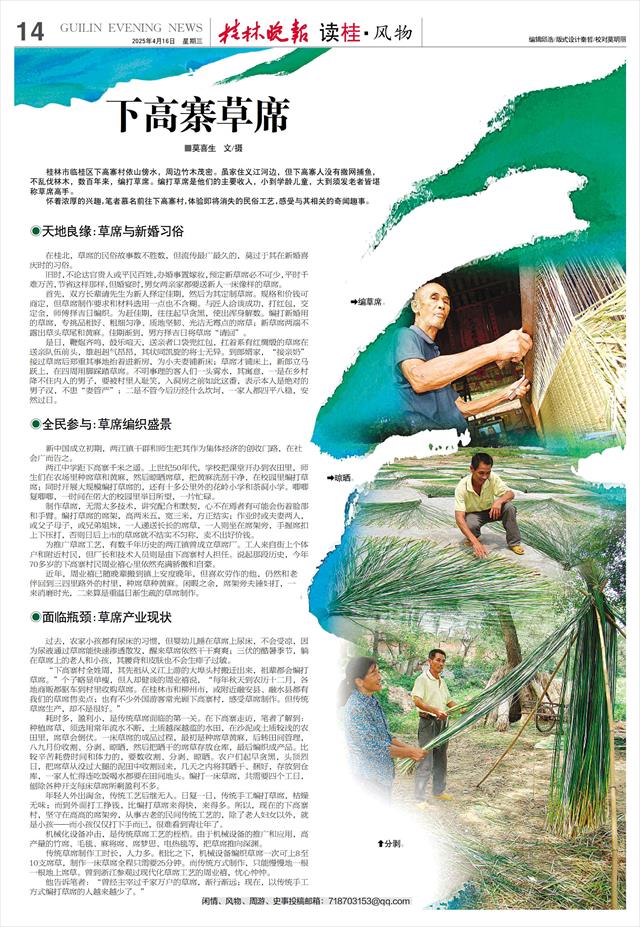 桂林市临桂区下高寨村依山傍水,周边竹木茂密。虽家住义江河边,但下高寨人没有撒网捕鱼,不乱伐林木,数百年来,编打草席。编打草席是他们的主要收入,小到学龄儿童,大到须发老者皆堪称草席高手。