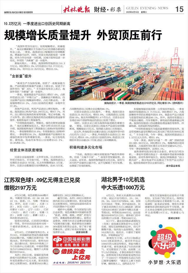 10.3万亿元 一季度进出口创历史同期新高 规模增长质量提升 外贸顶压前行   “我国外贸顶压前行,实现规模增长、质量提升。”海关总署副署长王令浚4月14日在国新办新闻发布会上说,一季度,我国进出口规模创历史同期新高,增速逐月回升。同时,经营主体活跃度进一步增强,对外合作空间进一步拓展,区域开放布局进一步优化,外贸的“含新量”进一步提升。