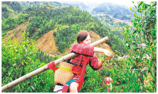 20日是谷雨,龙胜各族自治县龙脊镇中六村当天举行龙脊古树茶祭茶节活动,活动现场展演了具有当地特色的“飞天”采茶。 记者滕嘉 摄