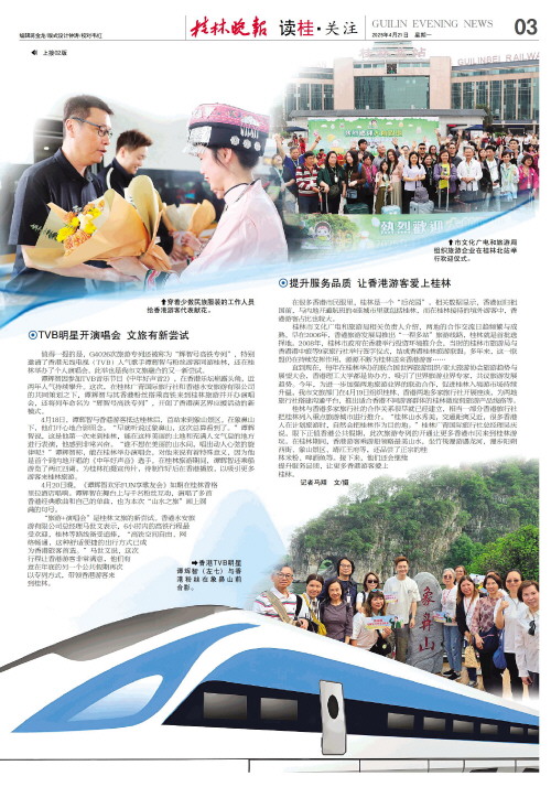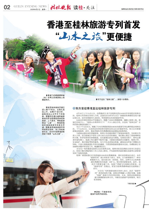 “山水之旅”更便捷   香港至桂林高铁开通已进入第7个年头,从西九龙站上车,仅需3个多小时,就能直达山水甲天下的桂林。便捷的交通让越来越多香港市民在假期选择来桂林旅游。上个周末,两地旅游联动“上新”—香港至桂林的高铁旅游专列首次开通。随着多列高铁旅游专列陆续抵达桂林,加上其他高铁车次,近5000名香港游客感受了绝美“山水之旅”。
