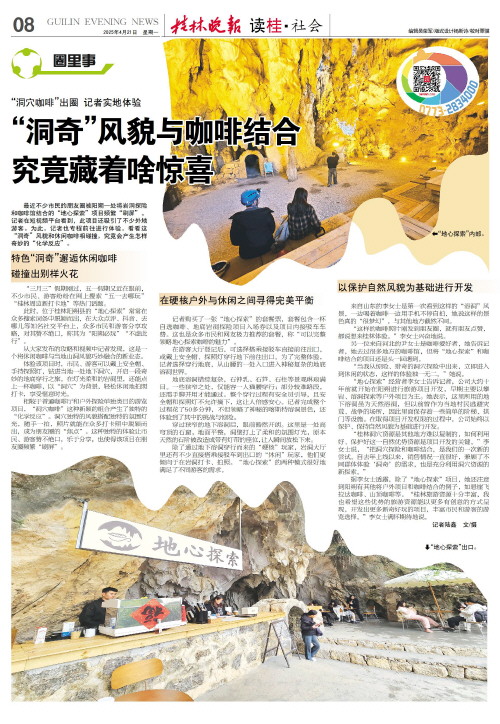 究竟藏着啥惊喜   最近不少市民的朋友圈被阳朔一处将岩洞探险和咖啡馆结合的“地心探索”项目频繁“刷屏”。记者在短视频平台看到,此项目还吸引了不少外地游客。为此,记者也专程前往进行体验,看看这“洞奇”风貌和休闲咖啡相碰撞,究竟会产生怎样奇妙的“化学反应”。