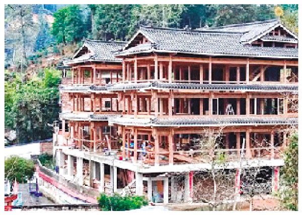↑石善章用传统手工艺搭建的三层新木楼构架。