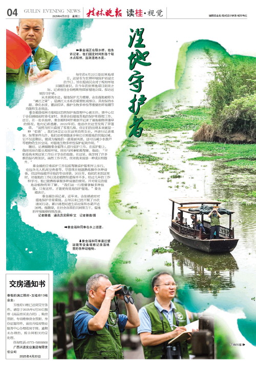 湿地守护者   位于临桂区会仙镇的会仙湿地被称作“漓江之肾”。日前,记者前往会仙喀斯特国家湿地公园,探访“漓江之肾”的守护者。●详见 4、5 版