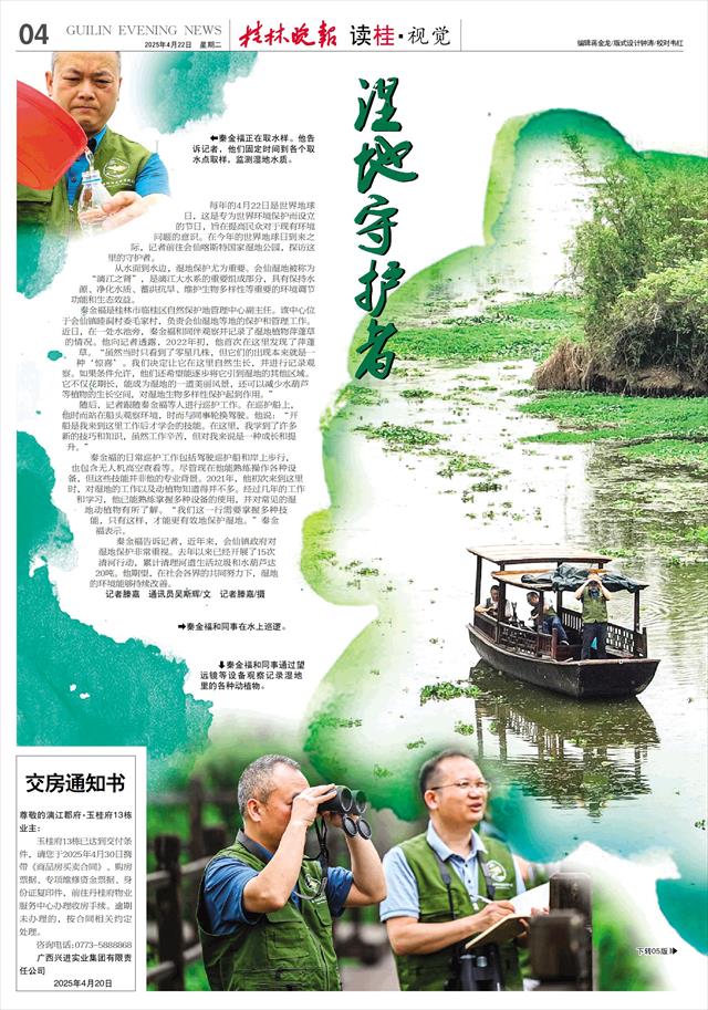 位于临桂区会仙镇的会仙湿地被称作“漓江之肾”。日前,记者前往会仙喀斯特国家湿地公园,探访“漓江之肾”的守护者。●详见 4、5 版