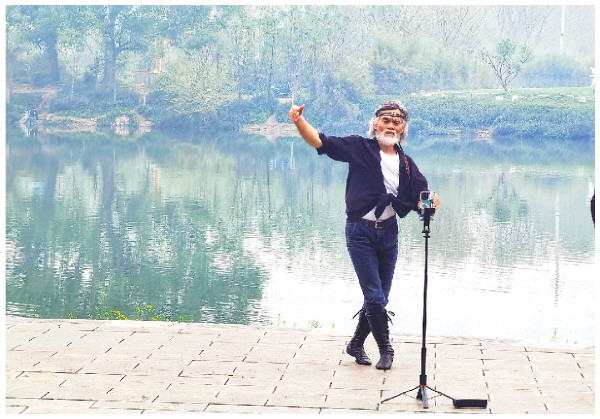 近日,在穿山景区,一名穿着时尚的男子随着音乐翩翩起舞,并用手机记录下这一美好时刻。记者滕嘉 摄
