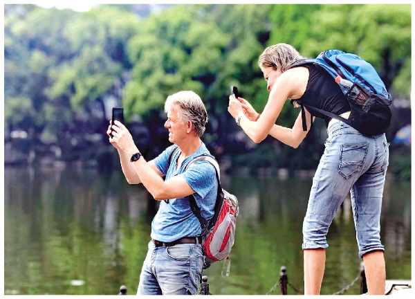 4月27日下午,大雨过后的市区空气清新,山水风光更加灵动。两位外国游客在两江四湖景区拿起手机拍摄,记录这里的美景。 记者邢刚 摄