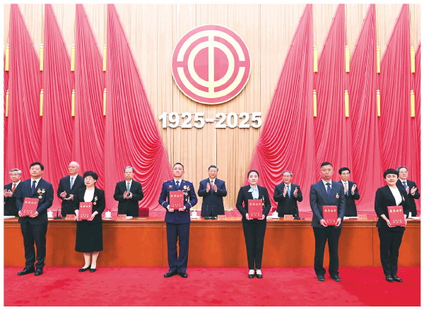 人民大会堂大礼堂气氛隆重热烈。主席台上方悬挂着“庆祝中华全国总工会成立100周年暨全国劳动模范和先进工作者表彰大会”会标,后幕正中悬挂中国工会会徽,会徽下方是“1925-2025”字标,10面红旗分列两侧。二楼眺台悬挂着标语:“以习近平新时代中国特色社会主义思想为指导,坚定不移听党话跟党走,在以中国式现代化全面推进强国建设、民族复兴伟业中充分发挥工人阶级主力军作用和工会桥梁纽带作用!”