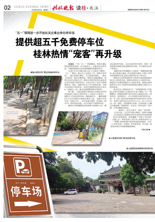 桂林热情“宠客”再升级   本报讯 今年“五一”假期期间,桂林各城区和阳朔等县将进一步开放机关、企事业单位停车场,为畅游桂林的市民和游客提供免费停车位。