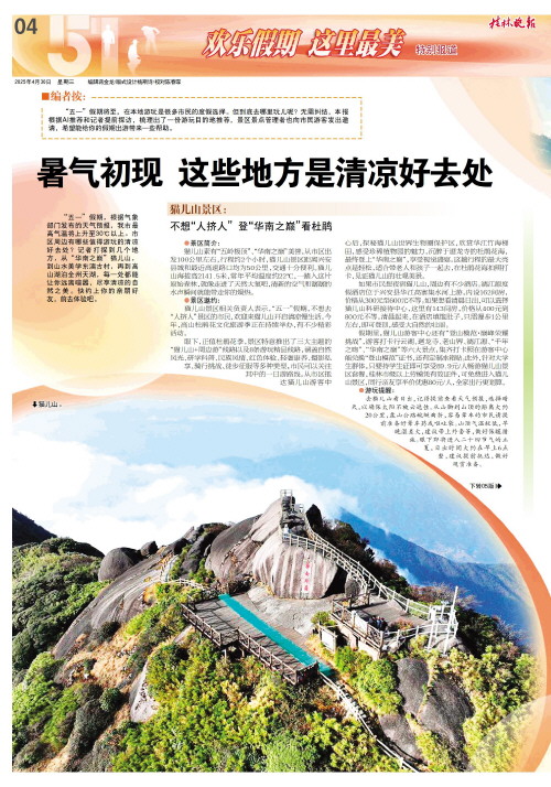 “五一”假期,根据气象部门发布的天气预报,我市最高气温将上升至30℃以上。市区周边有哪些值得游玩的清凉好去处?记者打探到几个地方,从“华南之巅”猫儿山,到山水美学东漓古村,再到高山湖泊全州天湖,每一处都能让你远离喧嚣,尽享清凉的自然之美。快约上你的亲朋好友,前去体验吧。