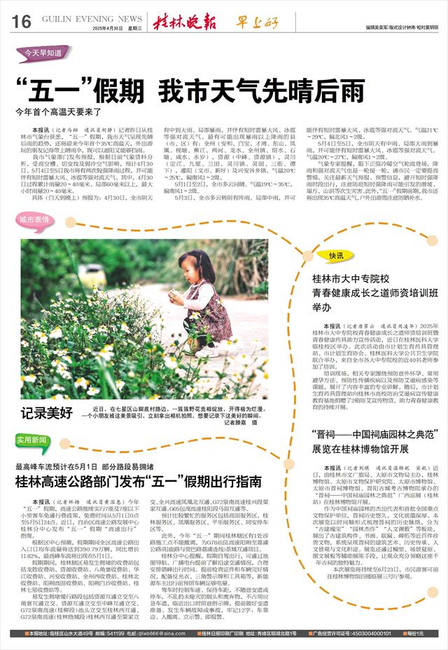 本报讯(记者马翔 通讯员胡静)记者昨日从桂林市气象台获悉,“五一”假期,我市天气呈现先晴后雨的趋势,还将迎来今年首个35℃高温天,外出游玩的朋友记得带上晴雨伞,既可以遮阳又能够挡雨。