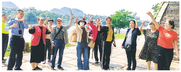 4月29日,秀峰区秀峰街道解东社区组织居民代表开展“民族团结健步走 清廉风润五一节”主题活动。当天,参与活动的居民们精神抖擞地沿着漓江步道健步而行。在步道两边,社区工作人员在江边景观树上精心隐藏悬挂了关于民族团结、反诈和健康卫生等知识问答题。居民们在健步走的过程中化身“寻宝者”,现场气氛热烈,居民们还义务向路人宣传保护漓江的意义。