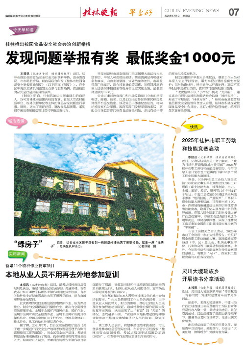 桂林推出校园食品安全社会共治创新举措 发现问题举报有奖 最低奖金1000元   本报讯(记者周子琪 通讯员周振宇)近日,桂林市推出校园食品安全社会共治创新举措,由市教育局、市市场监管局、财政局联合印发《桂林市校园食品安全举报奖励制度》(以下简称《制度》),在全区率先以奖励机制激发公众参与监督热情,营造校园食品安全社会共治良好氛围。
