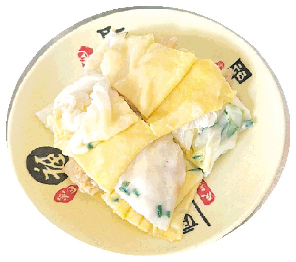 根据推荐,记者也点了一份瘦肉鸡蛋肠粉。只见老板手法娴熟,先在簸箕上刷一层油,再舀一勺米浆倒入,如耍杂技般旋转簸箕,使米浆均匀铺开;接着打入新鲜鸡蛋,加入生菜和肉末,最后送入蒸箱。两分钟后,取出簸箕,用铲子轻轻一铲,一条圆润饱满、白嫩透亮的肠粉便呈现在眼前。