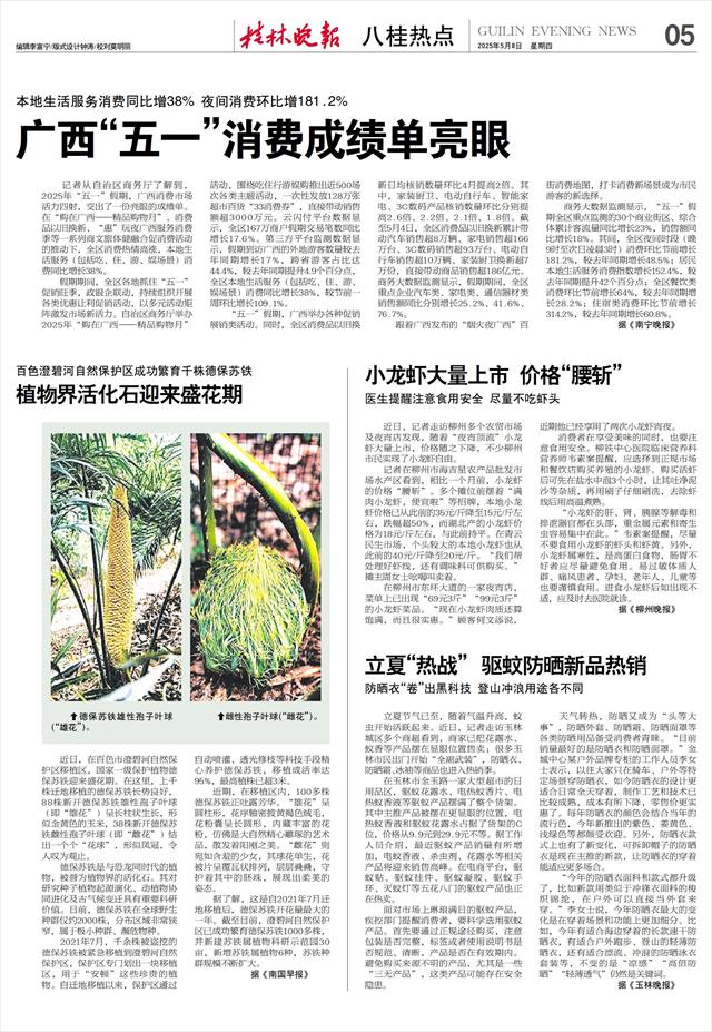 记者从自治区商务厅了解到,2025年“五一”假期,广西消费市场活力四射,交出了一份亮眼的成绩单。在“购在广西——精品购物月”、消费品以旧换新、“惠”玩夜广西服务消费季等一系列商文旅体健融合促消费活动的推动下,全区消费热情高涨,本地生活服务(包括吃、住、游、娱场景)消费同比增长38%。