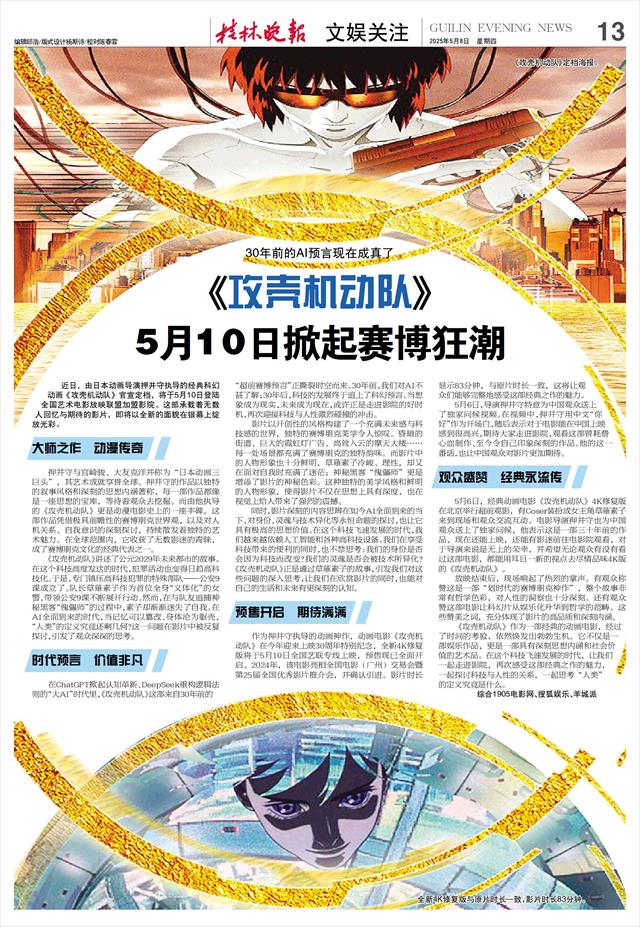 在ChatGPT掀起认知革新、DeepSeek重构逻辑法则的“大AI”时代里,《攻壳机动队》这部来自30年前的“超前赛博预言”正撕裂时空而来。30年前,我们对AI不甚了解;30年后,科技的发展终于追上了科幻预言。当想象成为现实,未来成为现在,或许正是走进影院的好时机,再次迎接科技与人性激烈碰撞的冲击。