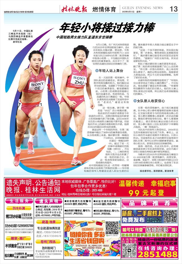 5月11日晚,在广州天河体育场进行的2025年世界田联接力赛中,由4名年轻队员施君豪、曾克理、王胜杰和何锦櫶组成的中国男子4×400米接力队以38秒03在第二轮资格赛中取得小组第一,不仅跑出中国队在该项目的赛季最佳,而且夺下了一张宝贵的直通东京田径世锦赛的门票。