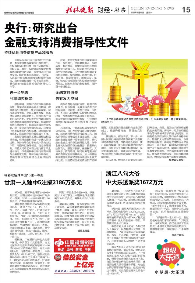 5月6日,福彩双色球第2025050期开奖,当期全国中出15注637万多元一等奖,甘肃一人独中5注揽3186万多元,广东中出1注落户深圳。