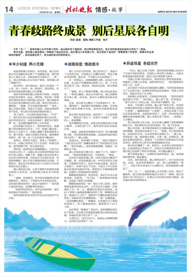 今年“五一”,是我和盈心分手的第十四年,她回了趟桂林,我父母特意请她和她的父母吃了一顿饭。她已经是两个孩子的母亲了,打算过几年回国在高校当教授,我为她的成功而感到高兴。